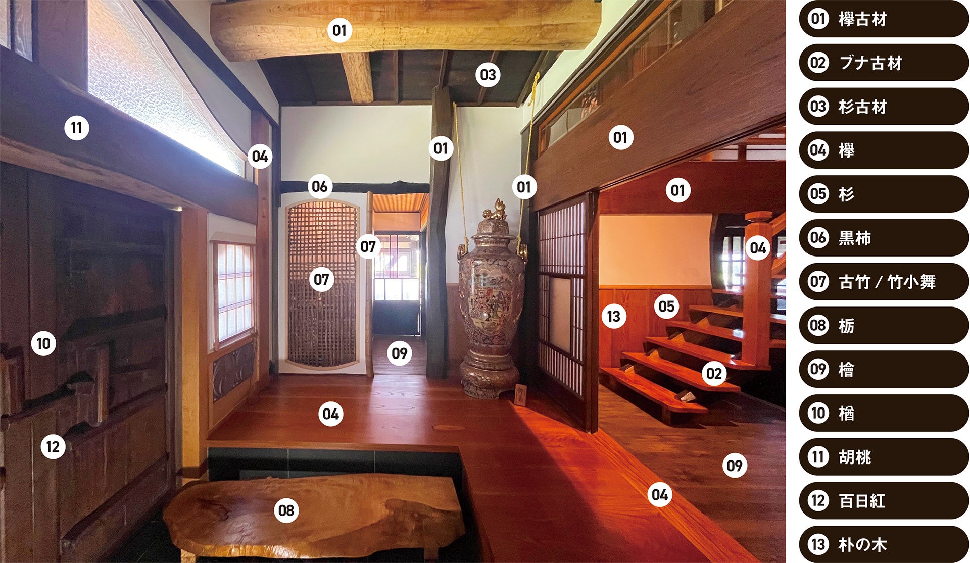 残る約60%では、欅/檜/杉/タモ/楢/胡桃/栃/百日紅/朴の木等の多様な国産無垢材を適所活用しています。古材と国産材の適材適所活用の徹底を通じて、炭素排出低減と、木のぬくもり・美を両立しています。