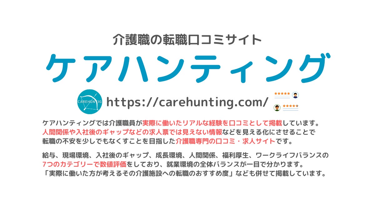 ケアハンティングでは介護職員のリアルな口コミを活かし、自分に合った介護施設を探せる転職支援サービスを提供しています。