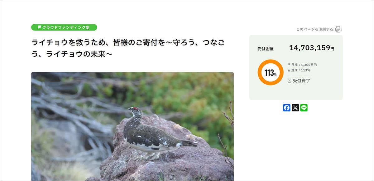 「県鳥」であるライチョウについて、県では環境省が主導する保護対策に協力と支援を行っています。2020(令和2)年度、2021(令和3)年度にはクラウドファンディングを実施。今年度は「ガチなが」を活用したところ、より多くの寄付が集まりました。