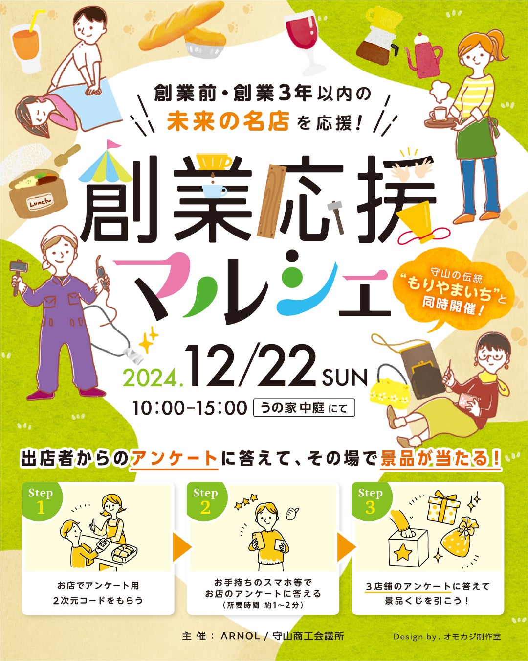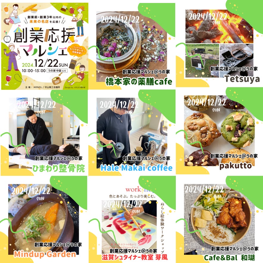 12月22日(日)創業3年以内の事業者だけが出店する「創業応援マルシェ」を初開催します。守山伝統のお祭り「もりやまいち」の会場のひとつである「うの家」にて新規事業者がテストマーケティングに挑戦します。