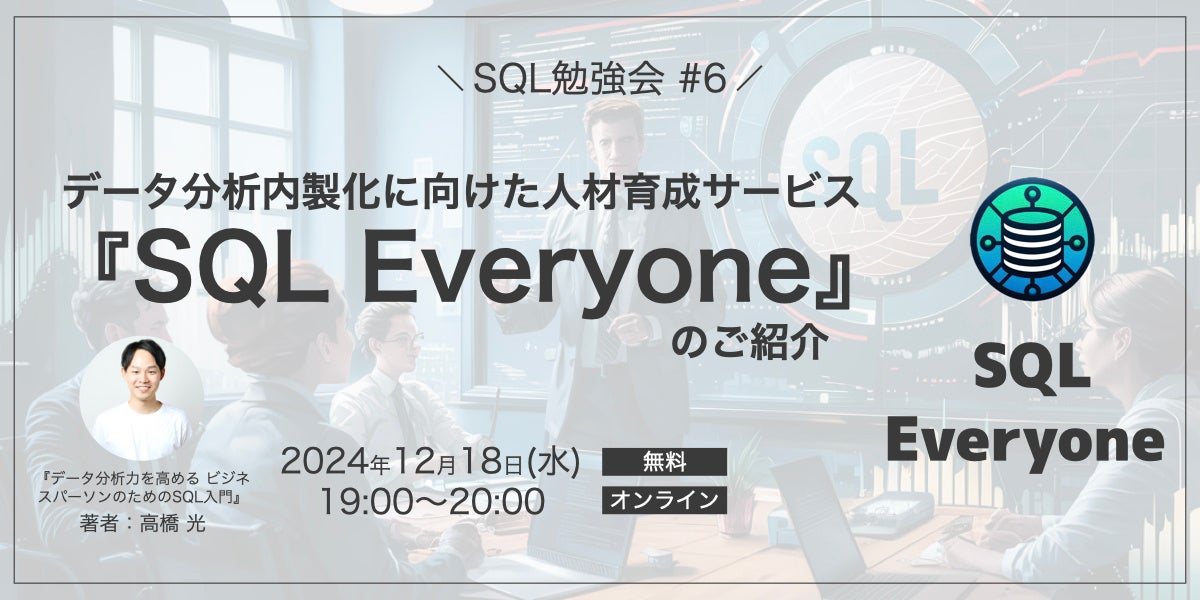 12月18日(水)19時からSQL Everyoneのサービス説明会を実施します。ご興味ある方はぜひ無料セミナーにご参加ください。本セミナーでは、SQLを使ったデータ分析のデモも交えながらデータ分析においてなぜSQLが重要なのか解説しながら、SQL Everyoneについてのサービス説明を行います。