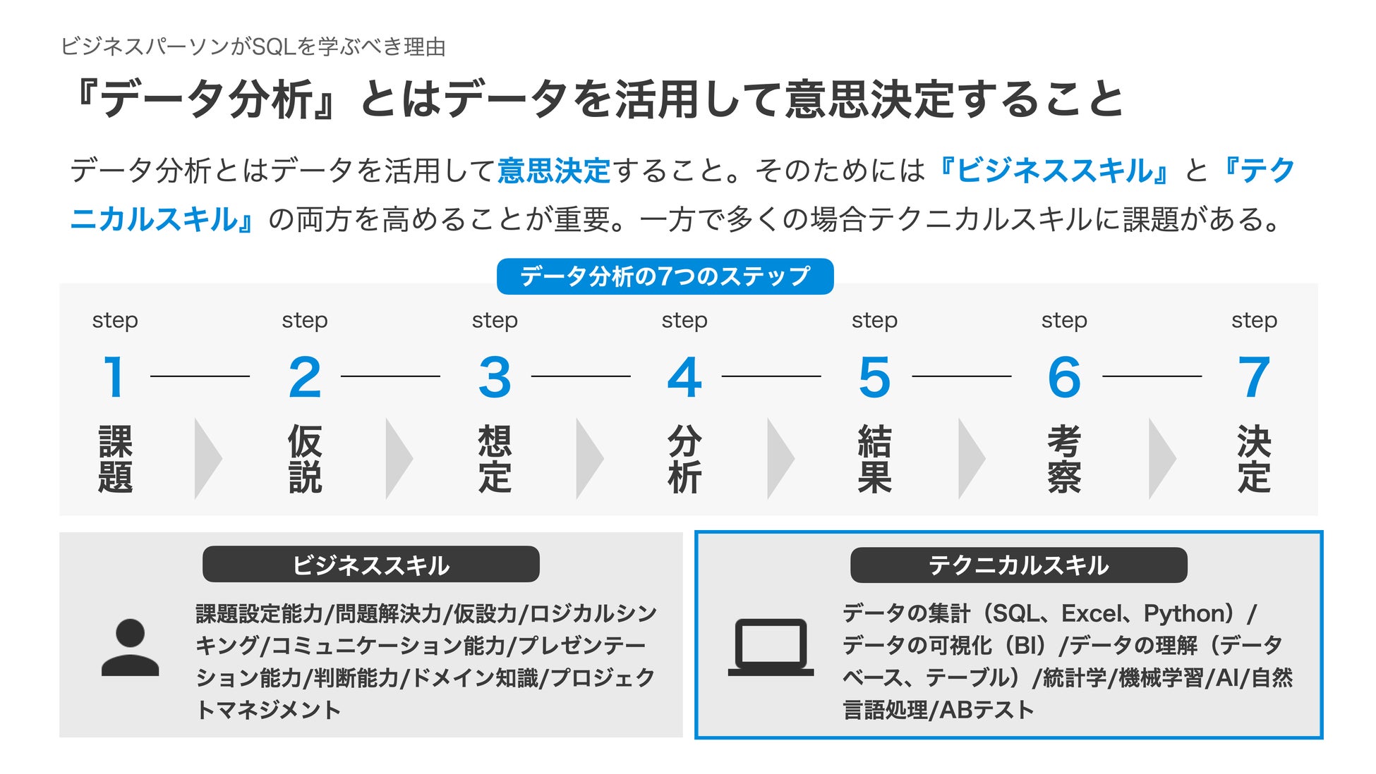データ分析人材の育成にはいくつかの課題があります。データ分析とは『データを活用して意思決定すること』です。そのためには課題設定能力や論理的思考能力などのビジネススキルと、データ集計に必要なExcel、SQL、BI、Python、統計学などのテクニカルスキルの両方が必要になります。