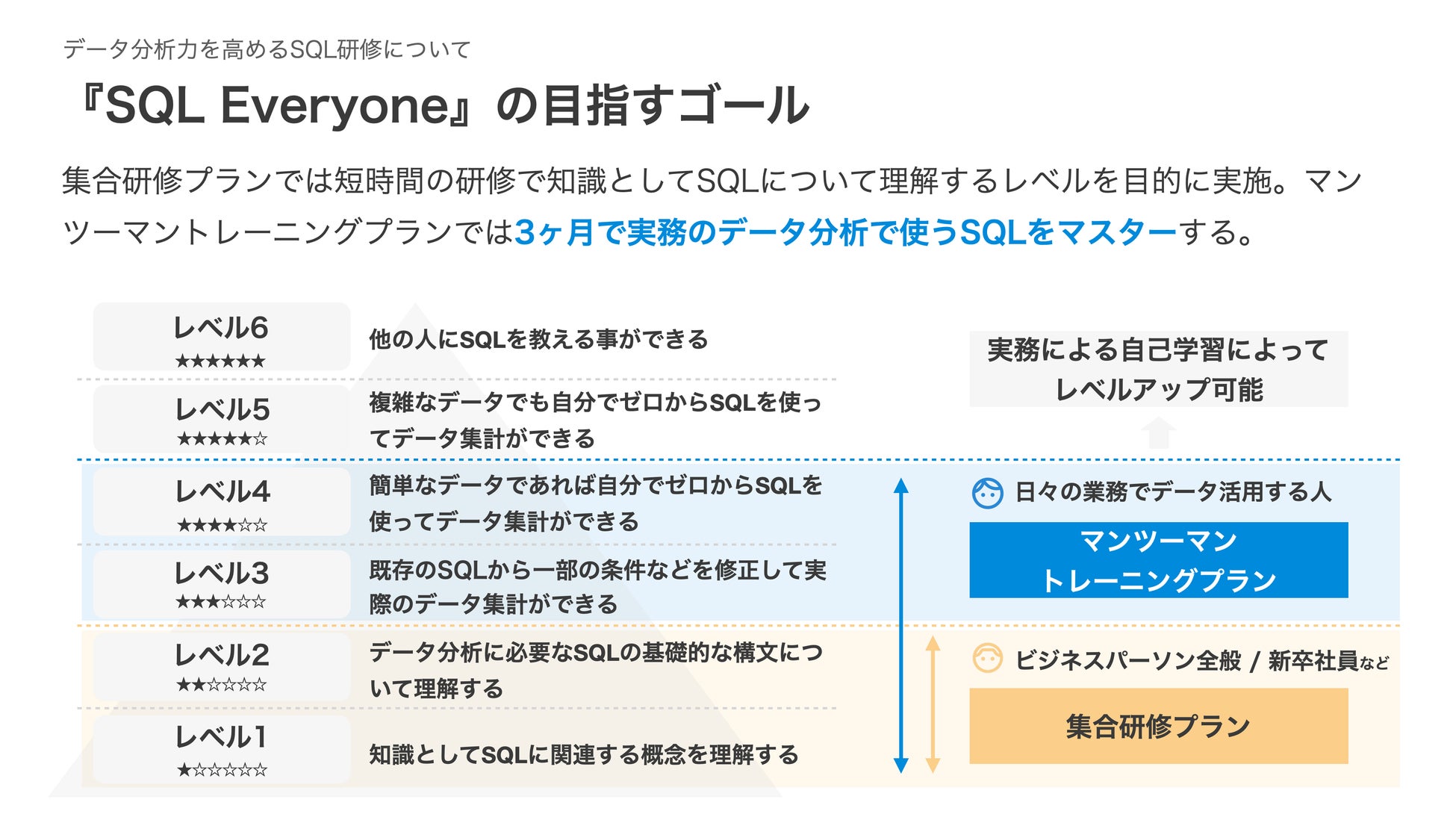 「集合研修プラン」「マンツーマントレーニングプラン」のどちらも対象者はSQLを触ったことがない人、データ分析をしたことがない人です。ゼロから一定の知識とスキルを得られるように支援します。