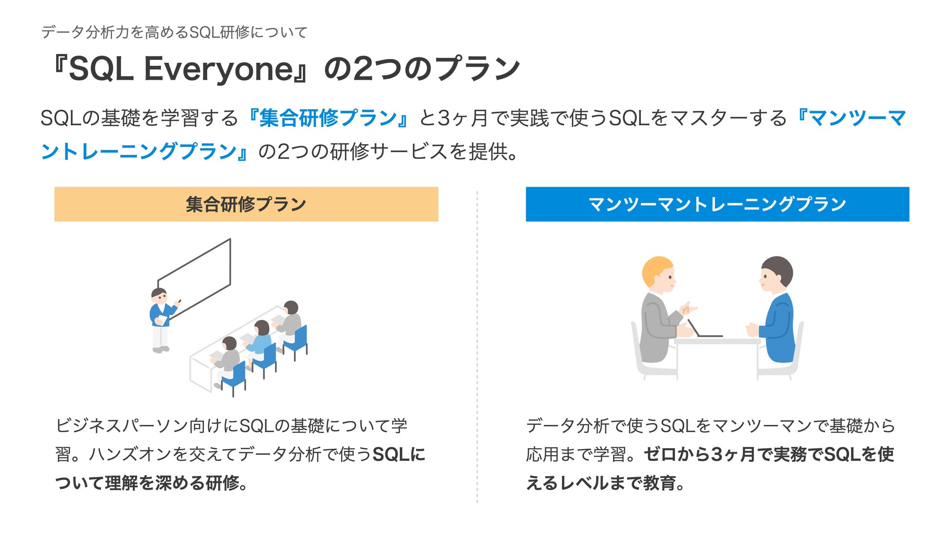 『SQL Everyone』では多くの人にデータ分析で使うSQLの基礎を学習してもらう『集合研修プラン』と、3ヶ月でゼロからSQLを使ったデータ分析ができるようにマンツーマンで支援を行う『マンツーマントレーニングプラン』との2つのサービを提供しています。