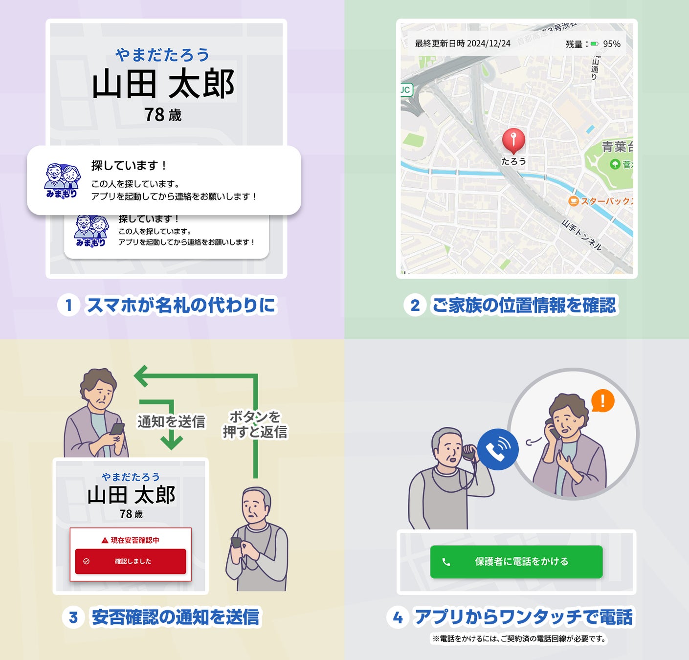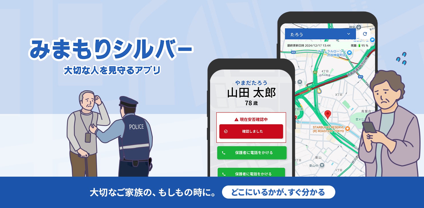 みまもりシルバーは、認知症などで見守りや保護が必要な高齢者を、スマートフォンアプリを通じて、居場所の確認や本人確認を第三者ができるスマホアプリです。
