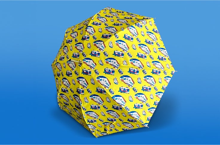 今回のクラウドファンディングで制作する子供用の傘。新幹線をイメージした「百万石フォント」である『かがやき愛アール』をあしらっています。傘は石川県の「弁当忘れても傘忘れるな」という言葉にちなみ、重要なシンボルとなっています。