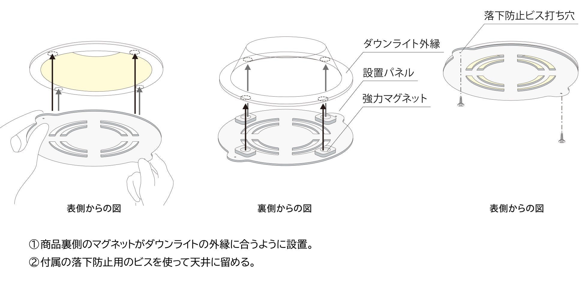 今あるダウンライトの鉄製の縁にダウンライトキャップの裏側にあるマグネットを合わせて設置するだけで簡単に設置、LEDの交換など、電気工事は不要です。
