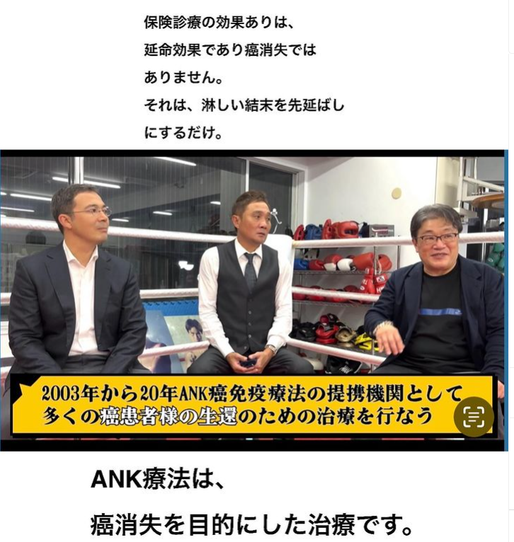 元ミドル級世界チャンピオンの竹原慎二氏も膀胱癌ステージ4からANK療法を受けられ10年以上再発なく御健在です。YouTubeの竹原TVでもこの体験談を語られています。