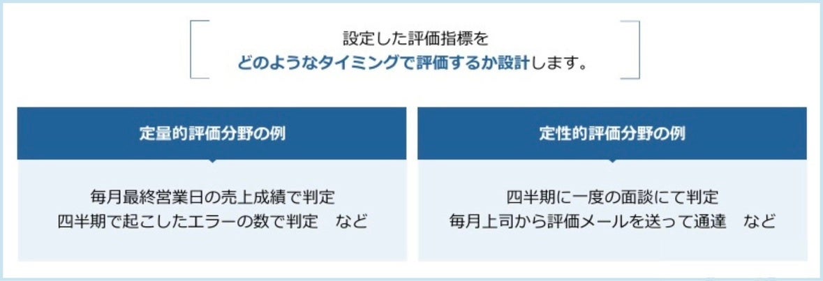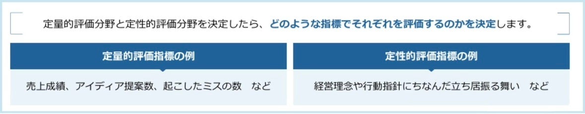 定量評価・定性評価それぞれの指標を決定し、測定可能な形で評価基準を明確化します。