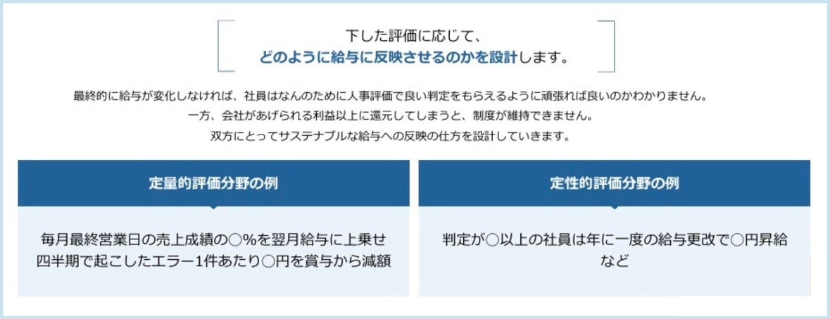 評価結果が給与にどのように反映されるかを設計し、評価の透明性を向上させます。また、評価決定権限を明確化し、公正な運用を担保します。
