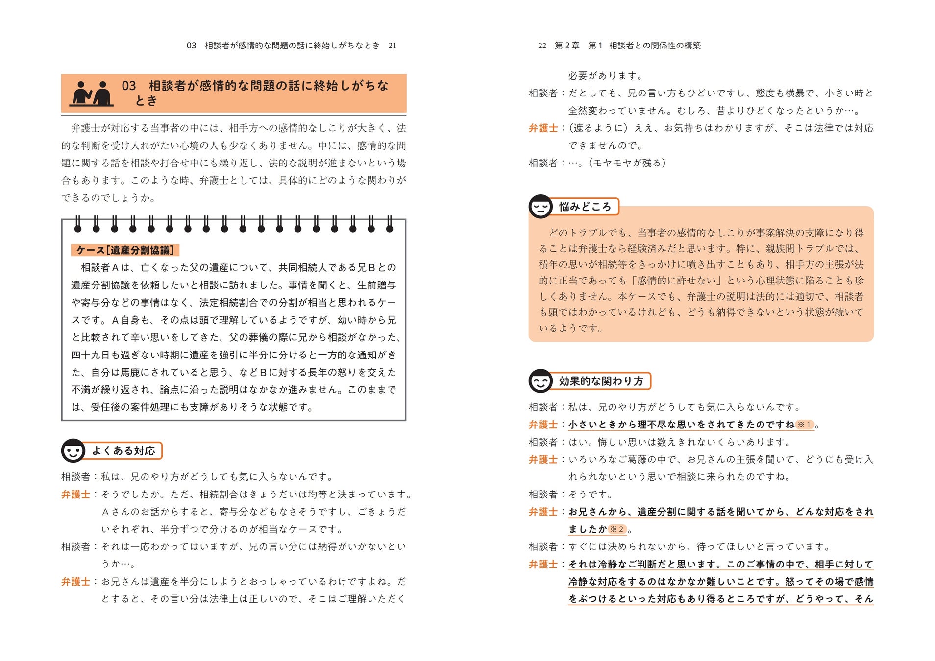 「よくある対応→悩みどころ→効果的な関わり方→解説」の構成で、依頼者対応の流れをつかむ!