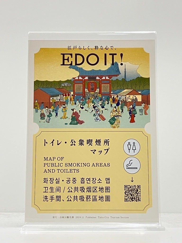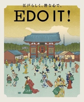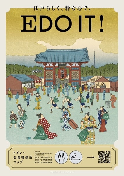 「EDO IT!」は、江戸らしくストレートに「DO IT!(やろう)」という呼びかけを込めたスローガンです。浅草地区を浮世絵タッチのビジュアルで表現し、観光マナー啓発を行います。