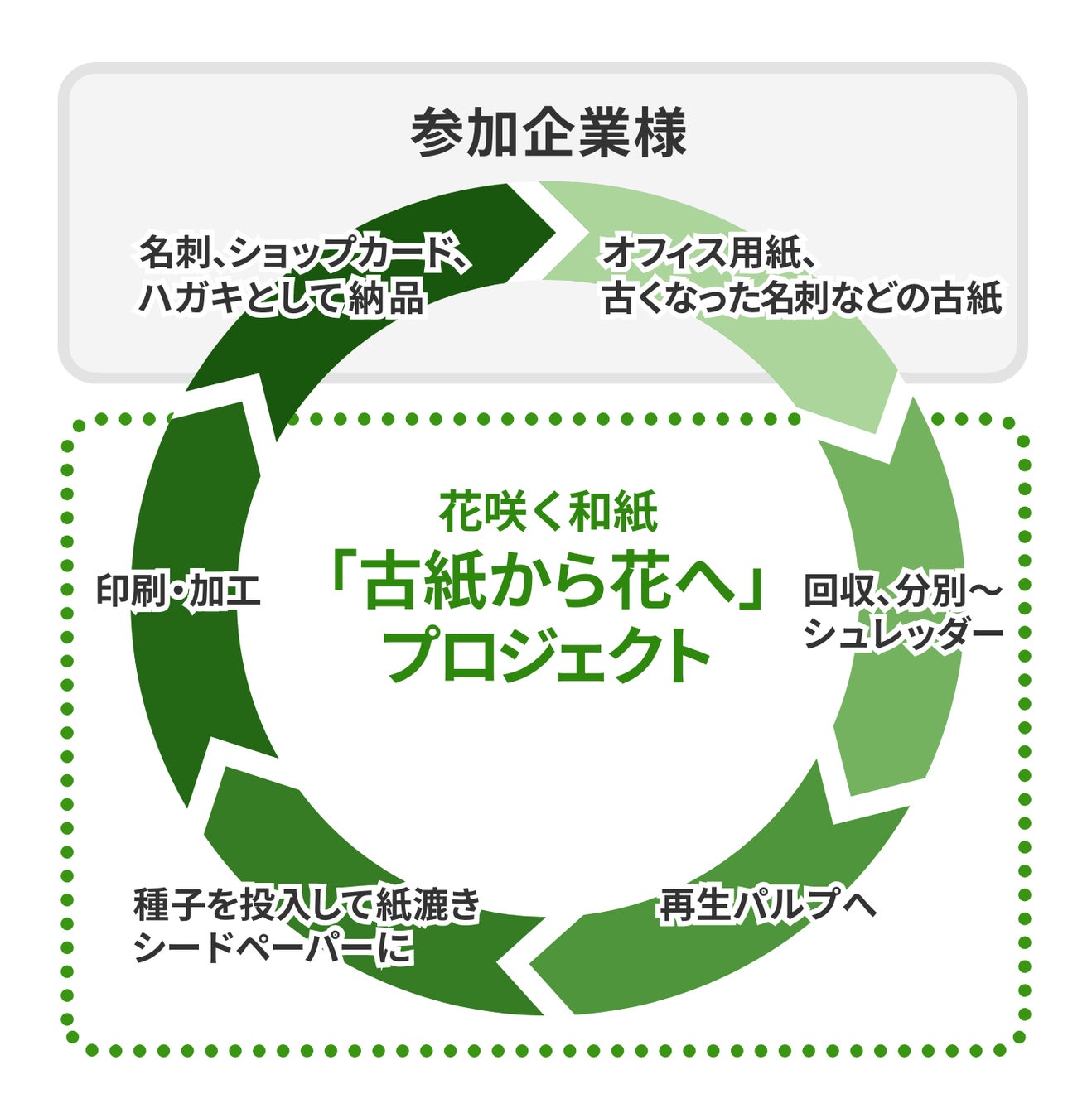 社内で印刷したり、コピーを取ったりするオフィス用紙や人事異動のたびに廃棄される名刺など、まだまだ大量に消費される紙が存在します。その一部をリサイクルし、花咲く和紙のカードやノベルティとして新たな役割を持たせることが可能です。役目を終えた紙は、土に埋めれば芽が出て育っていく様子を楽しんでいただけます。