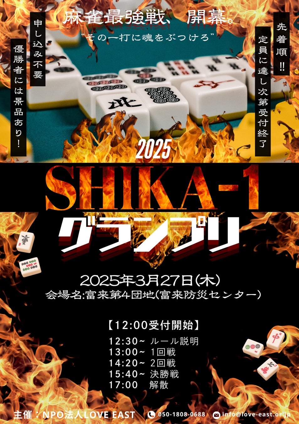 特定非営利活動法人LOVE EAST(代表理事:天野真信、所在地:石川県羽咋市、以下LOVE EAST)は2025年3月27日、能登・志賀町の仮設住宅地域で麻雀大会「SHIKA-1 グランプリ」を開催いたします。これまでの災害支援を通じて得た気づきを基にどなたでも参加しやすい企画をと考え、今回の企画に至りました。LOVE EASTは今後も能登半島の支援に尽力してまいります。