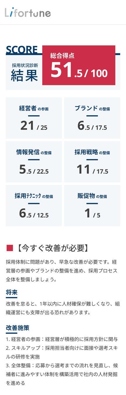 中小企業向け採用・組織コンサルティングを提供する株式会社LIfortune(本社:東京都文京区、代表取締役社長:渋谷喜之)は、2025年1月14日より中小企業の採用力を可視化し、具体的な改善施策を提案する無料ツール「採用力Scan(スキャン)」の提供を開始しました。