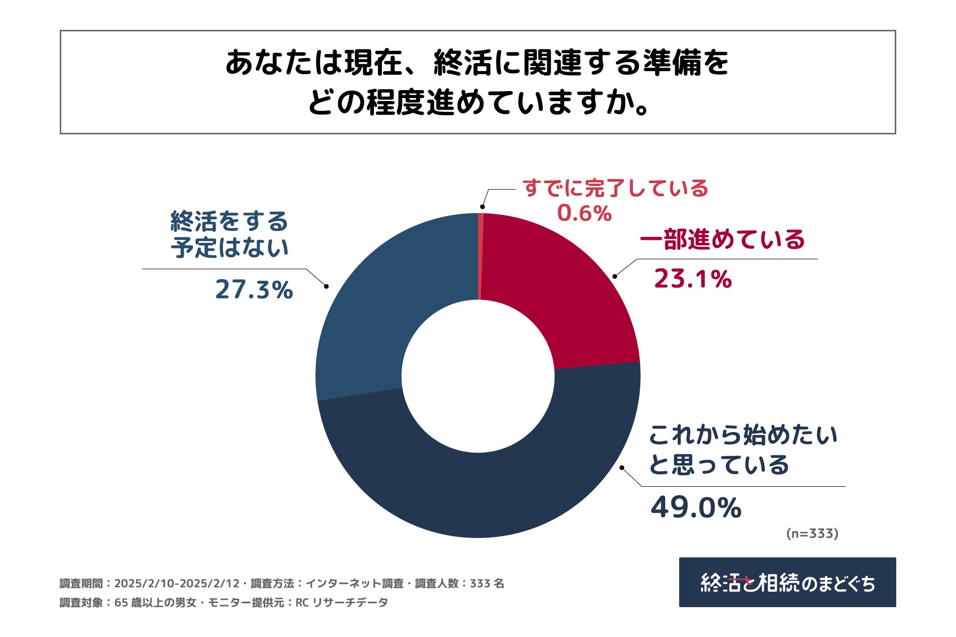 65歳以上の男女の約2割は終活に関連する準備をすでに進めており、約5割の人は「これから始めたい」と考えている