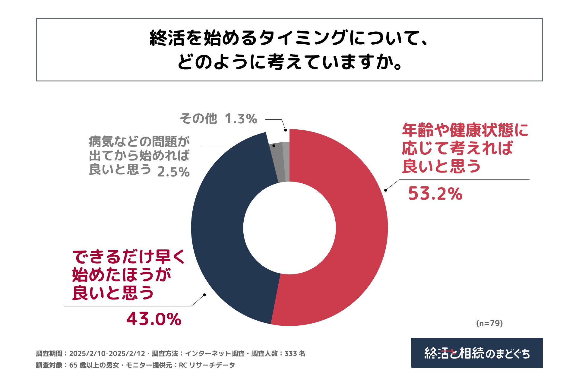 次に、終活に関連する準備をすでに完了している、または一部進めていると回答された方に「終活を始めるタイミングについて、どのように考えているか」を問う設問の回答では、1位が「年齢や健康状態に応じて考えれば良いと思う」で53.2%、2位が「できるだけ早く始めたほうが良いと思う」で43.0%、3位が「病気などの問題が出てから始めれば良いと思う」で2.5%という結果になりました。この結果から、終活を始めるタイミングは「年齢や健康状態に応じて考えれば良い」と考えている人が多いことが明らかになりました。