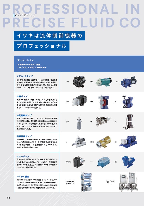 イワキは1956年(昭和31年)の創業以来、ケミカルポンプを中心とした流体制御機器を、産業を中心に提供し続け、「ケミカルポンプならイワキ」と評価されるまでに成長を遂げました。