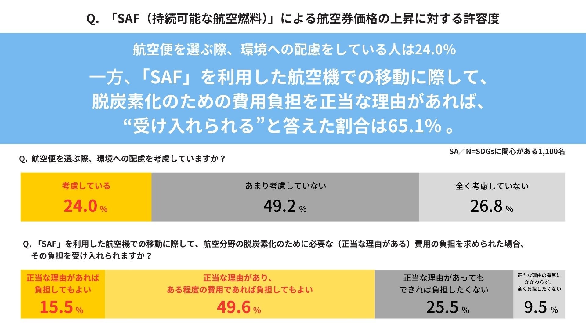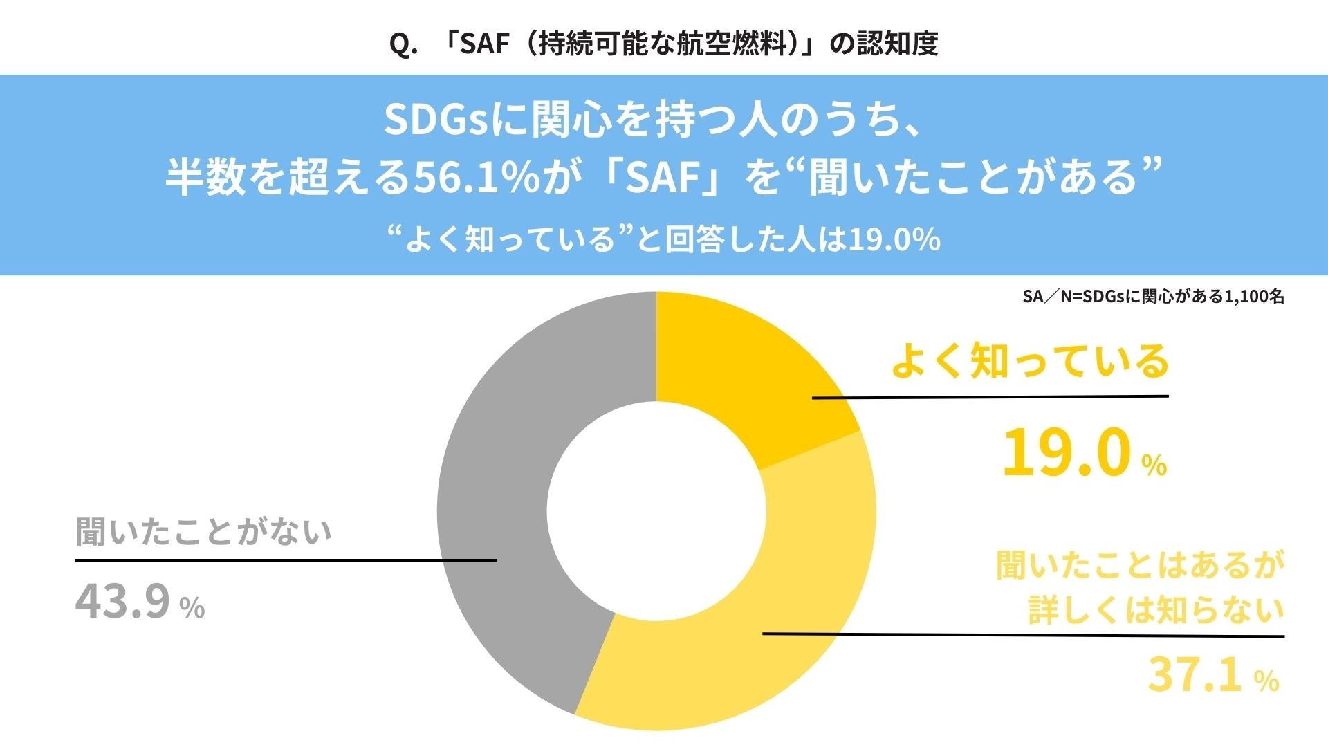 SAFの認知度は19.0%にとどまる一方、63.3%が航空業界のCO2削減取組を認識。期待度と支援意向の高さが示すポジティブな結果も!