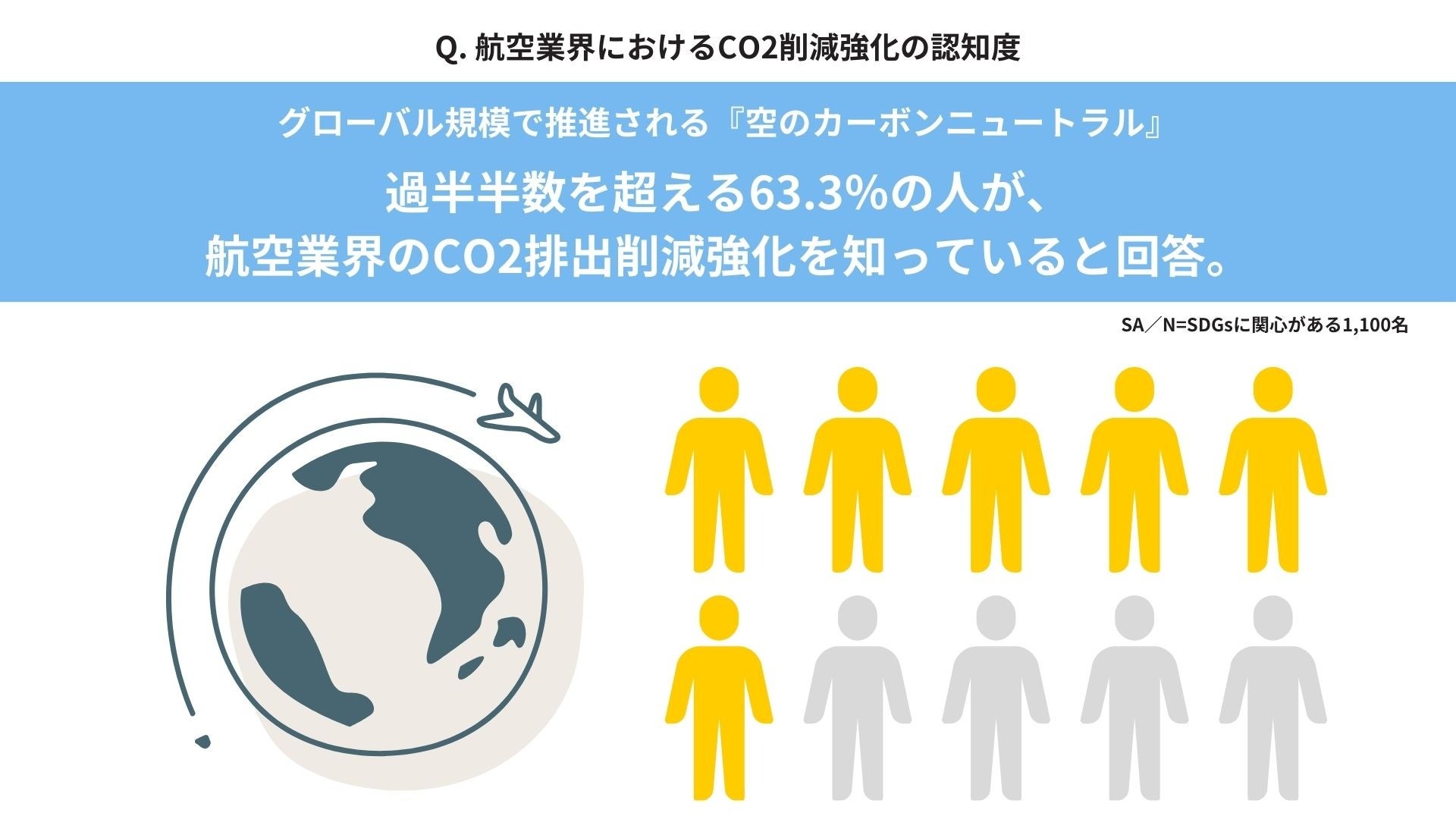 SDGs(持続可能な開発目標)に関心のある1,100名を対象に、航空業界がCO2排出削減に向けた取り組みを強化していることを知っているか調査したところ、過半数を超える63.3%の人が“知っている“と回答。航空分野における脱炭素化(空のカーボンニュートラル)の取組は、グローバル規模で進められ、日本でも強化されていることを背景に、その理解は広がりつつあります。