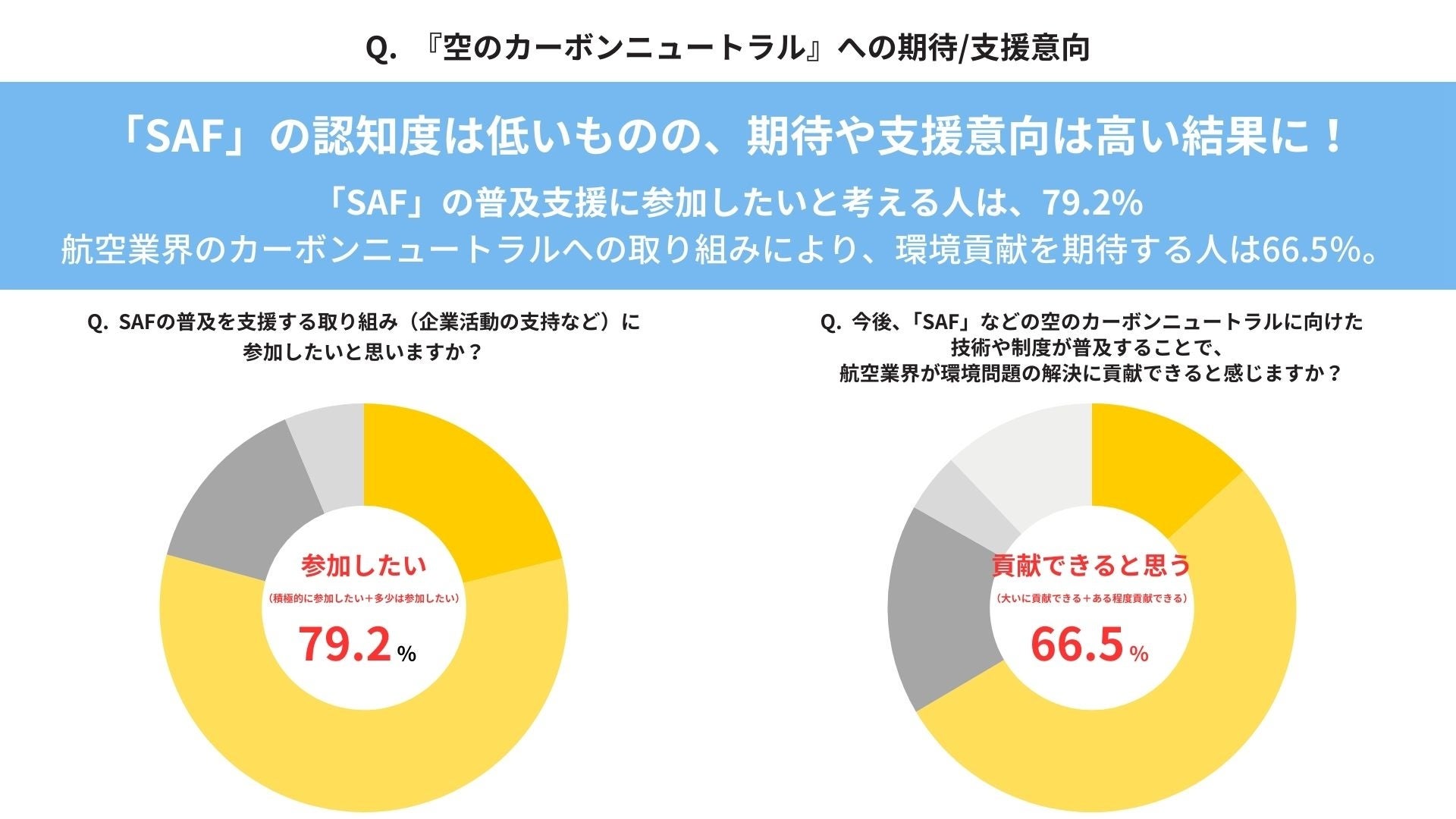 さらに、「SAF」の普及を支援する取り組みへの参加意向を調査したところ、約8割(79.2%)が参加したいと回答。加えて、「SAF」などの空のカーボンニュートラルに向けた技術や制度が普及することで、航空業界が環境問題解決に貢献できると答えた人は66.5%でした。