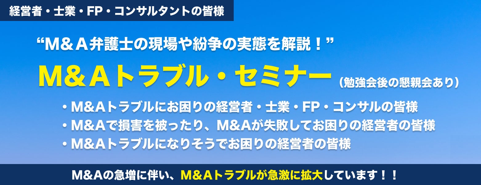 このセミナーでは、M&Aで相手方に損失補償請求をされたいと真剣に思われている経営者、担当者(M&A損害賠償請求をされそうになっている社長)の方向けにM&Aトラブル対応について解説いたしますので、セミナーを受講いただくと、M&Aや事業承継で必須である知識を知ることでトラブルを防げ、事前対策ができる可能性があります。その結果、M&Aの成功率が飛躍的に高まるはずです。