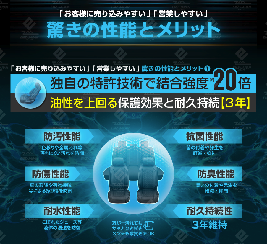 【自動車業界】水溶性シートコーティング 販売代理店と施工店の募集。長年の研究成果を結集した商品です。汚れを防ぐ新しいコーティング剤の提供を開始します。