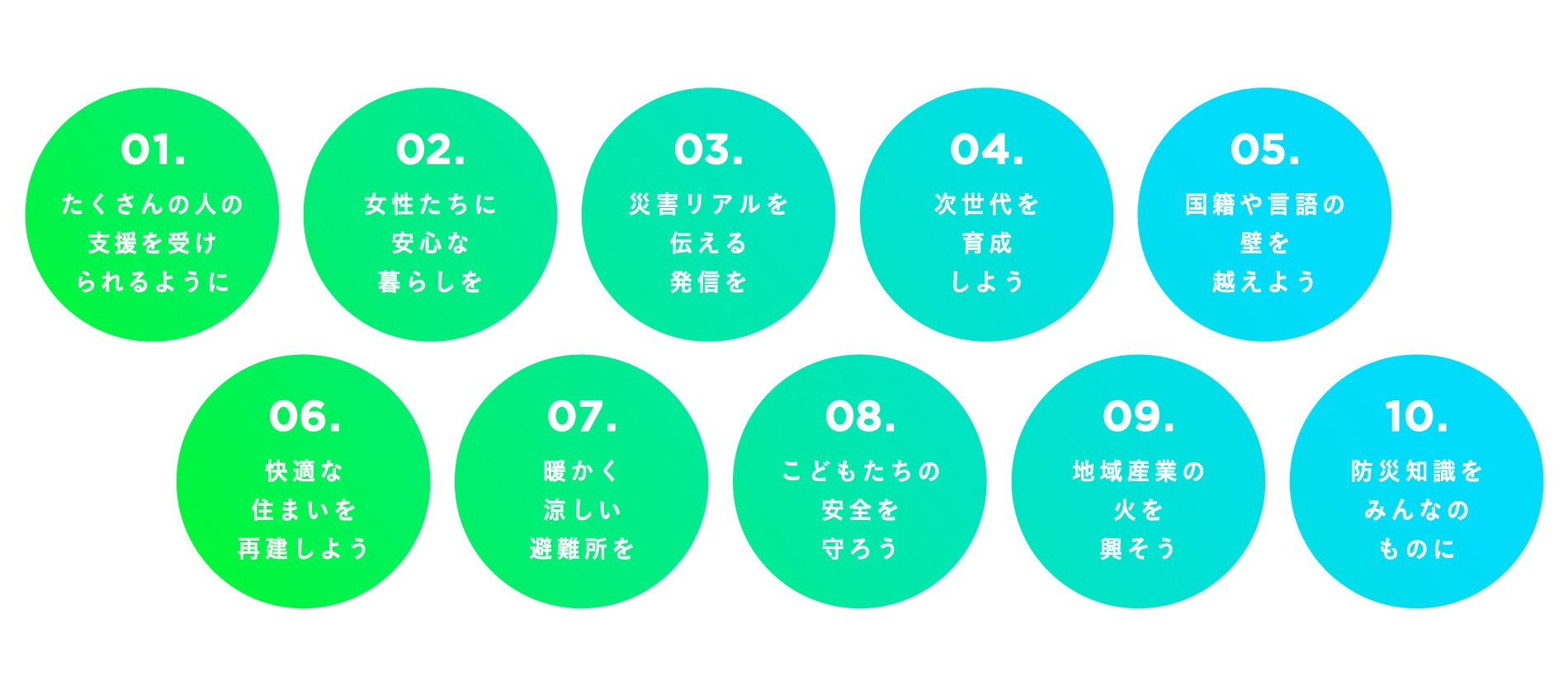 そこで、READYFOR財団は、長年災害支援を行ってきたFUKKO DESIGNとともに、埋もれがちな問題に取り組む団体を支援する「FUKKO GOALS基金」を設立しました。特に、災害時にできるだけ多くの方に支援を届けることや、トラブルに巻き込まれやすい女性や子ども、言葉が通じない外国人などへのサポートや、支援が後回しになりやすい観光業や農業などの生業の復興、さらに実態が把握されづらい被災現場の情報発信など、全部で10の課題を設定し、それらの課題の支援を行う団体に対して助成を行っていきます。災害時の課題は日々変わっていくため、10以外にも随時新たな課題を設定し、新たな課題にも柔軟に対応していく予定です。