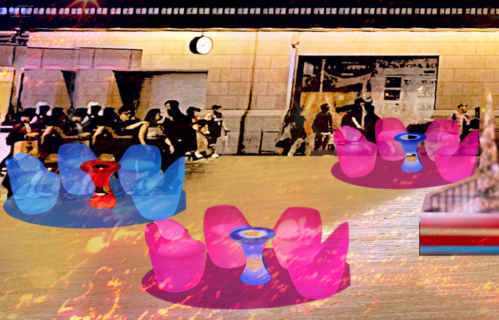 万博をイメージした青と赤に光るイスとテーブルを、広場内3カ所に設置します。