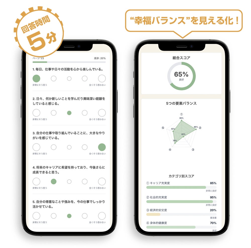 5分の〈幸福度バランス診断〉と専任サポーターで、悩みに合わせた最適サポートを実現