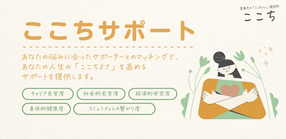 ウェルビーイングメディア「ここち」は、個々のウェルビーイング向上を目的としたマッチングサービス「ここちサポート」を公開しました。本サービスでは、ユーザーが5分・25問の「幸福度バランス診断」を受けた後、結果に応じて5つの分野に特化したサポーターを提案します。