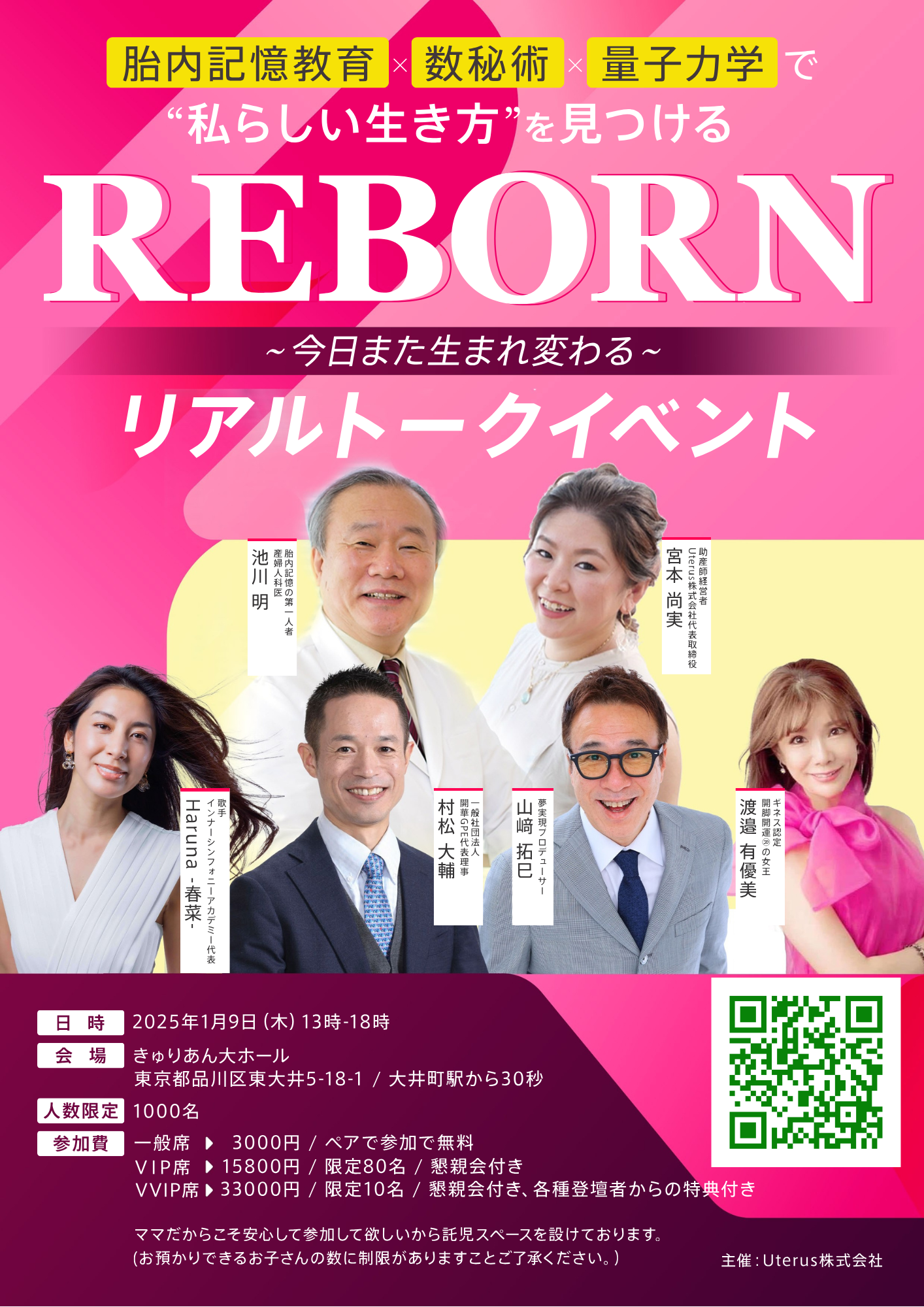 「産後うつをゼロにし、すべての女性が自分の才能を活かせる社会をつくる」という理念のもと、医療、心理学、トレーニング、音楽など幅広い分野の第一線で活躍する専門家が一同に揃い、2025年1月9日(木)にメンタルヘルス講演会「REBORN」を開催し、日常に取り入れやすい実践的な方法をお伝えします。
