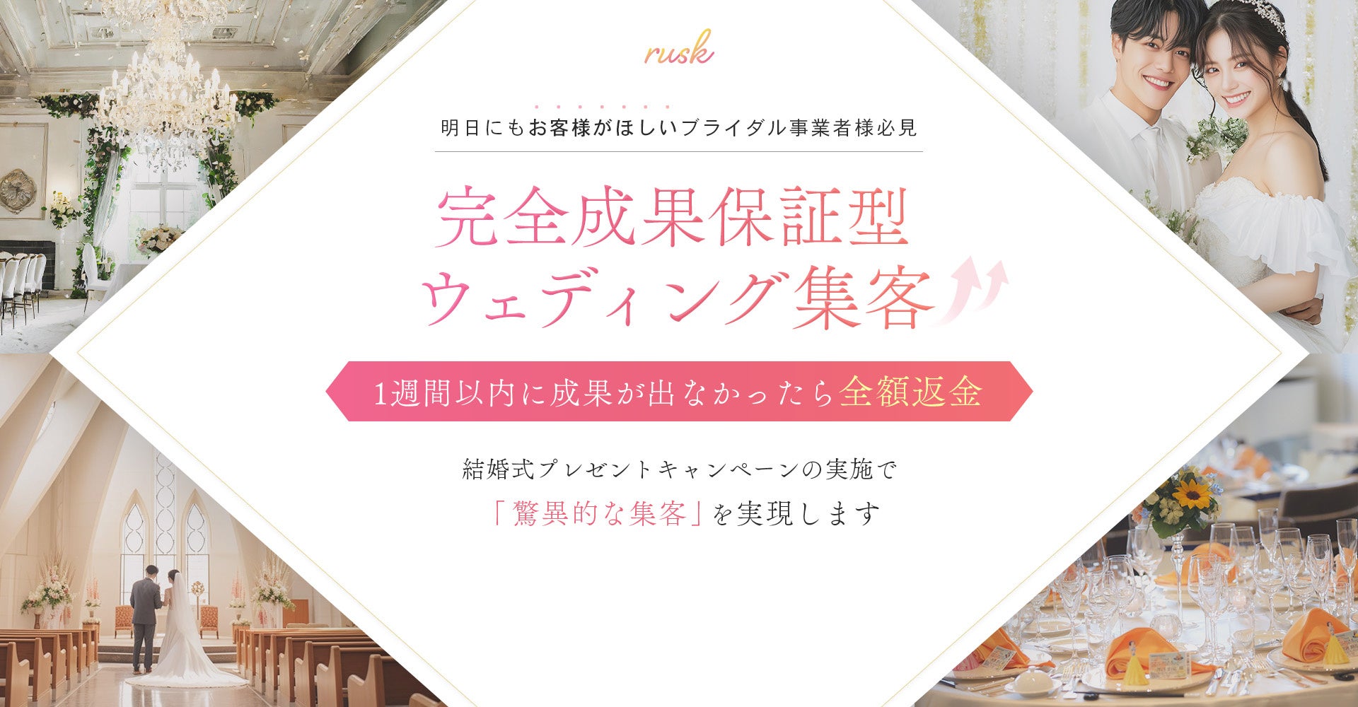 ブライダル業界の集客を支援する株式会社rusk(所在地:東京都港区、代表取締役:渡邊 徹)は、「1週間以内に成果が出なかったら全額返金」をお約束する完全成果報酬型ウェディング集客サービスの提供を開始しました。