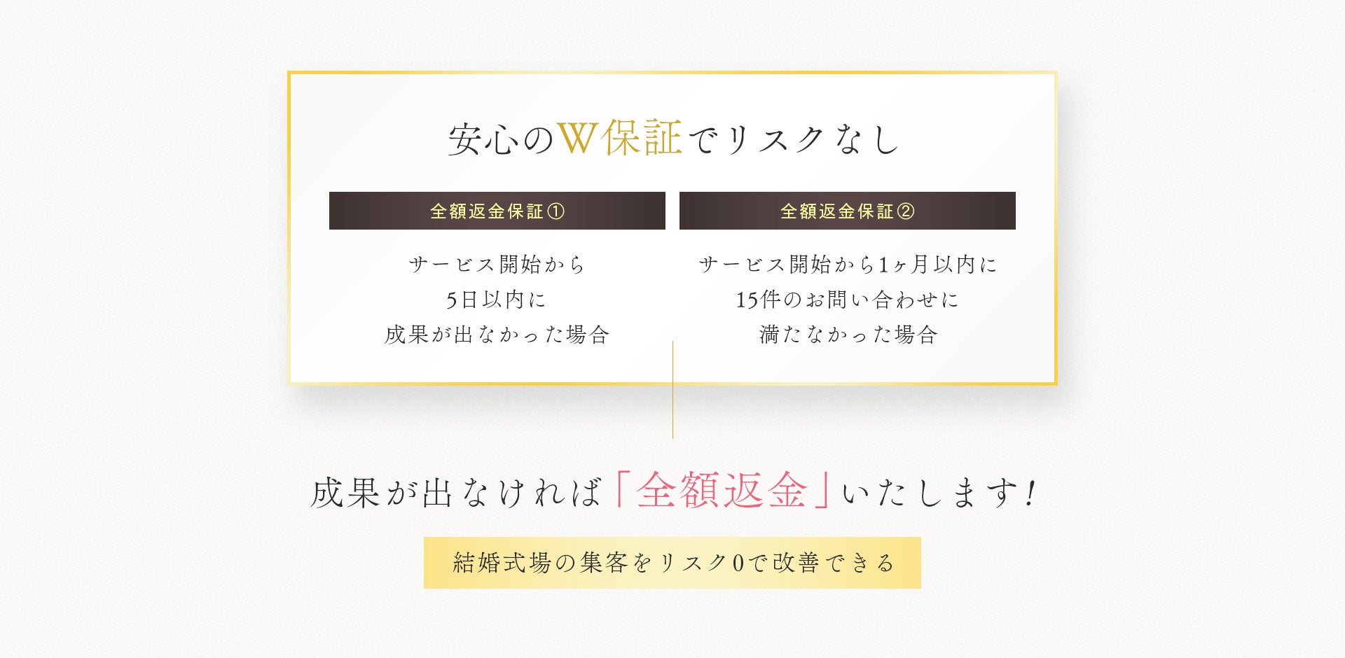 本サービスは保証集客数に満たなかった場合、全額返金をさせていただくため、ブライダル事業者様は広告費を無駄にするリスク無く、サービスの利用が可能となっております。