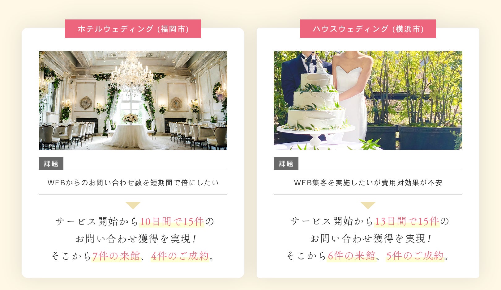 完全成果報酬型ウェディング集客サービスは、多くのお客様のご要望やヒアリングを踏まえ、お客様の広告予算を最低限に抑え、確実に成果が出るサービスの創出を目指したものとなっております。
