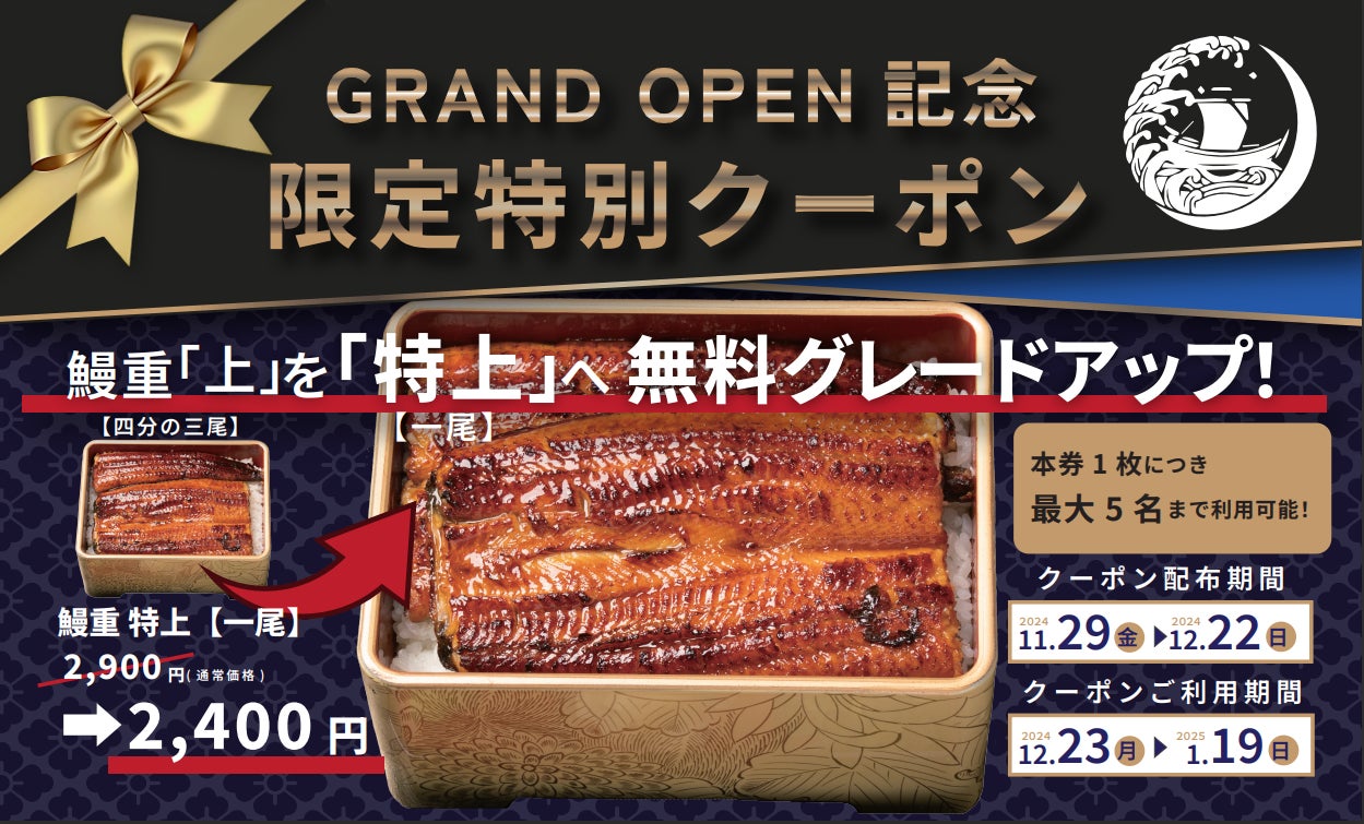 オープン記念として期間限定で鰻重(上)を鰻重(特上)へ無料グレードアップできるクーポンを配布いたします。通常価格2,900円の鰻重(特上)を期間限定特別価格2,400円で楽しむことができます。クーポン券1枚で最大5名様までご利用いただけますので、ぜひこの機会にご家族・ご友人様ともお越しくださいませ。