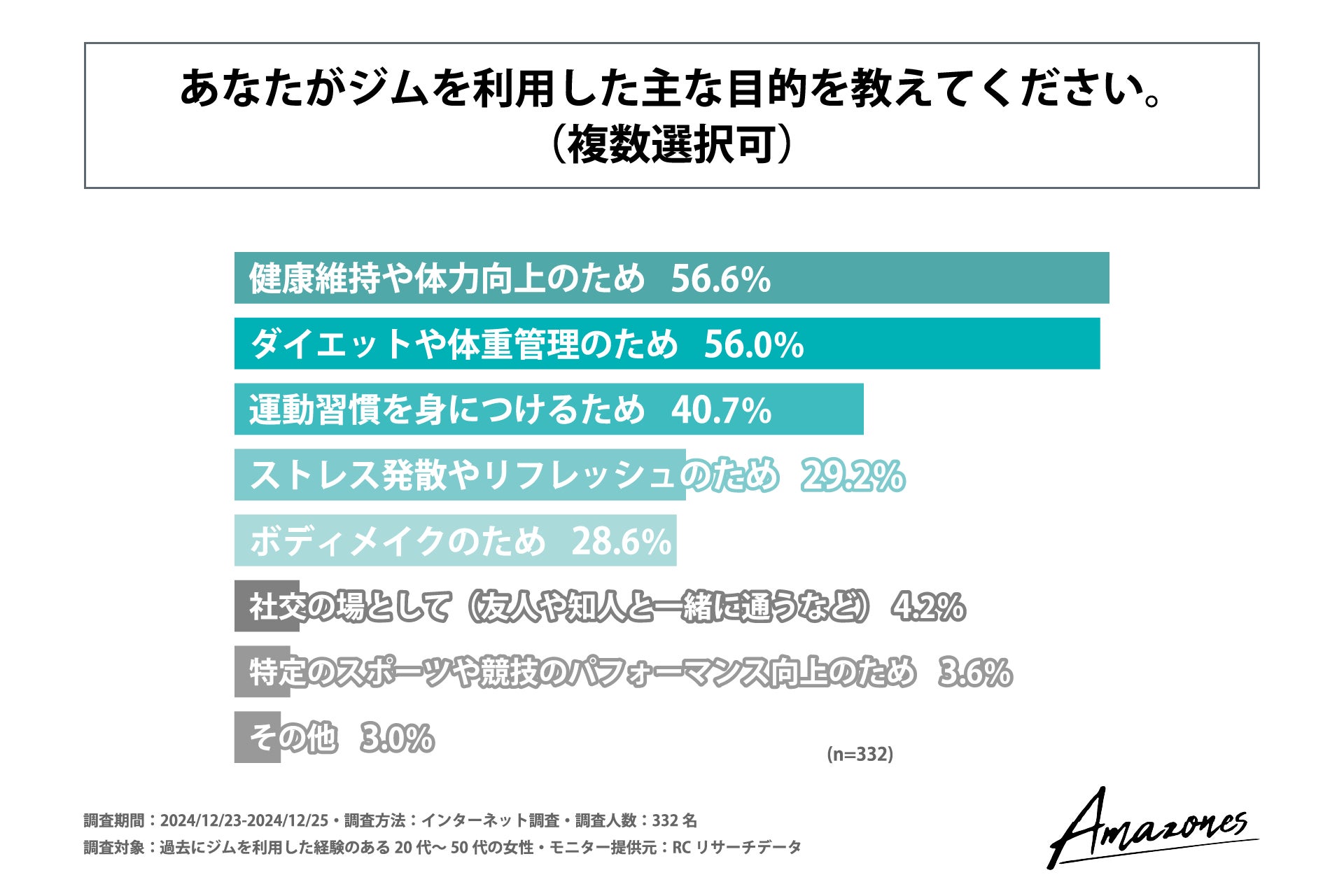 まず、「ジムを利用した主な目的」を問う設問への回答では、1位が「健康維持や体力向上のため」で56.6%、2位が「ダイエットや体重管理のため」で56.0%、3位が「運動習慣を身につけるため」で40.7%という結果になりました。この結果から、20代~50代の女性がジムに通う目的として最も多いのは「健康維持や体力向上」であることがわかりました。