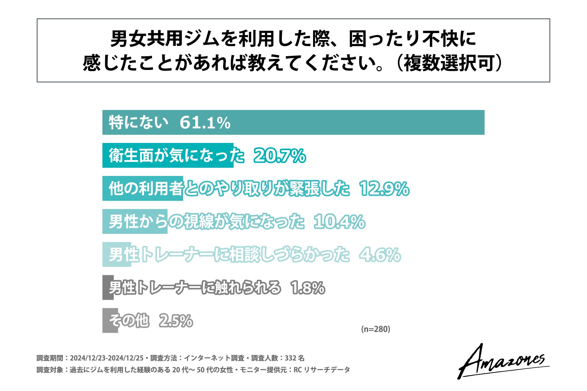男女共用ジムを利用した際、主に困ったり不快に感じたことは「衛生面」「他の利用者とのやりとり」「男性からの視線」