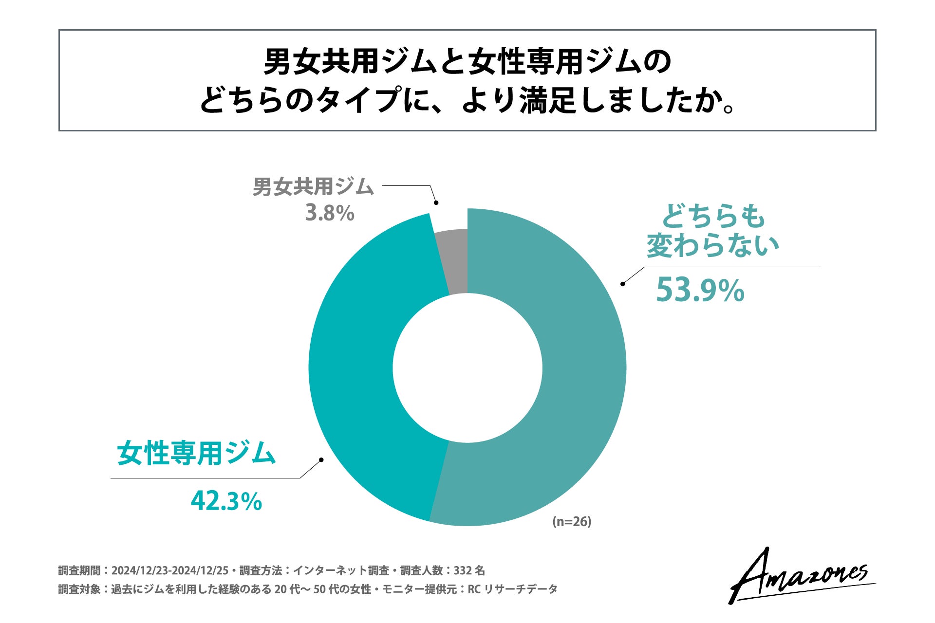 調査の最後、男女共用ジムと女性専用ジムのどちらも利用した経験がある、と回答された方に「男女共用ジムと女性専用ジムのどちらのタイプに、より満足したか」を尋ねる設問への回答で最も多かったのは「どちらも変わらない」で53.9%、次いで「女性専用ジム」が42.3%、「男女共用ジム」が3.9%という結果になりました。どちらも変わらないと回答された方も半数程度いるものの、双方のジムを利用した経験がある人の4割以上は「女性専用ジム」の方がより満足していることが明らかになりました。