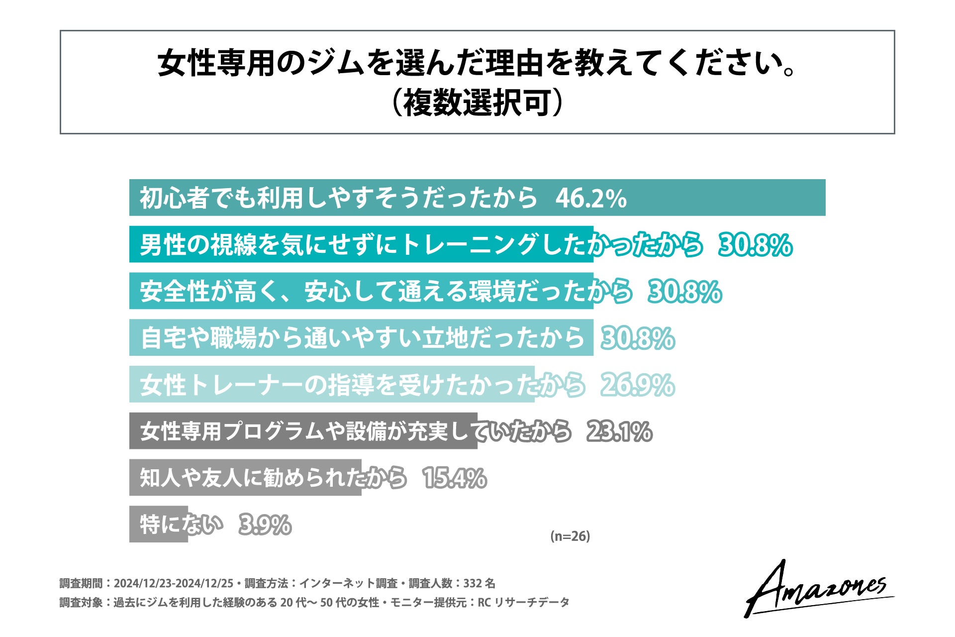 続いて、女性専用ジムを利用した経験があると回答された方に「女性専用のジムを選んだ理由」を問う設問への回答で多かったのは1位が「初心者でも利用しやすそうだったから」で46.2%、2位が同率で「男性の視線を気にせずにトレーニングしたかったから」「安全性が高く、安心して通える環境だったから」「自宅や職場から通いやすい立地だったから」で30.8%という結果になりました。この結果から、女性専用のジムを選んだ理由としては初心者でも利用しやすそうなことが、最も大きなポイントであったことが判明しました。