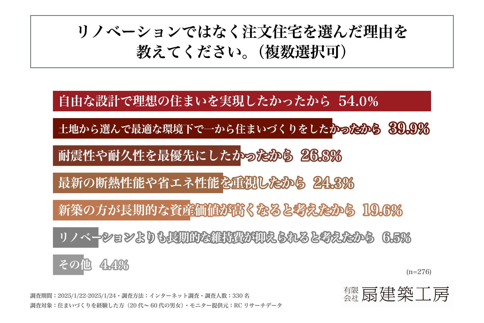 リノベーションではなく注文住宅を選んだ理由として最も多いのは「自由な設計で理想の住まいを実現したかったから」