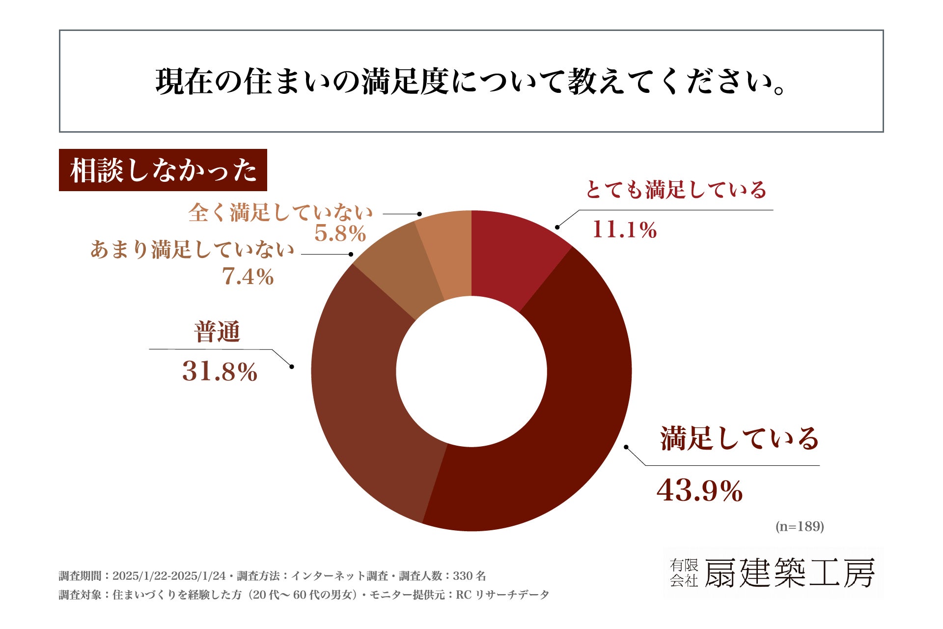 住まいづくりを検討する際、新築やリノベーションという枠を超えた最適な提案を行い、設計から施工まで一貫して対応できる建築士に相談しなかった人で、現在の住まいに満足している人の割合は55%