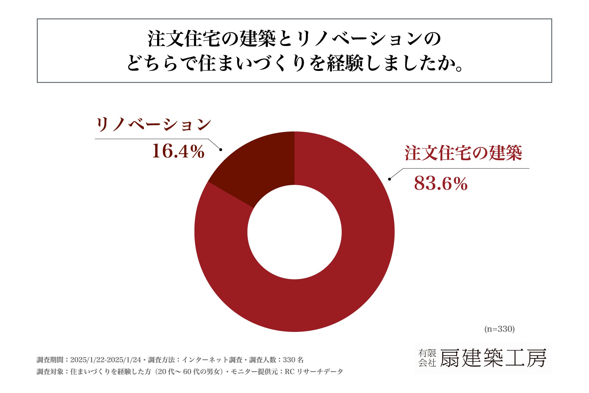 まず、「注文住宅の建築とリノベーションのどちらで住まいづくりを経験したか」を尋ねる設問への回答では、「注文住宅の建築」が83.6%、「リノベーション」が16.4%という結果になりました。この結果から「注文住宅の建築」で住まいづくりを経験した人が多い、ということが明らかになりました。