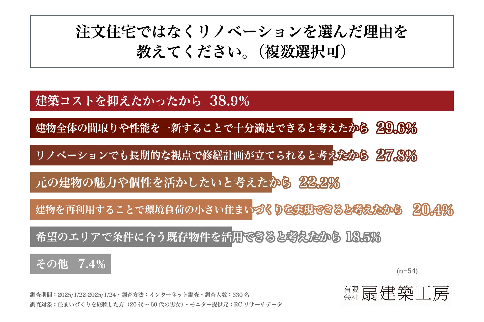 続いて、リノベーションで住まいづくりを経験したと回答された方に「注文住宅ではなくリノベーションを選んだ理由」を尋ねる設問への回答では、1位が「建築コストを抑えたかったから」で38.9%、2位が「建物全体の間取りや性能を一新することで十分満足できると考えたから」で29.6%、3位が「リノベーションでも長期的な視点で修繕計画が立てられると考えたから」で27.8%という結果になりました。この結果から、注文住宅ではなくリノベーションを選んだ理由として最も多いのは「建築コストを抑えたかったから」であることがわかりました。