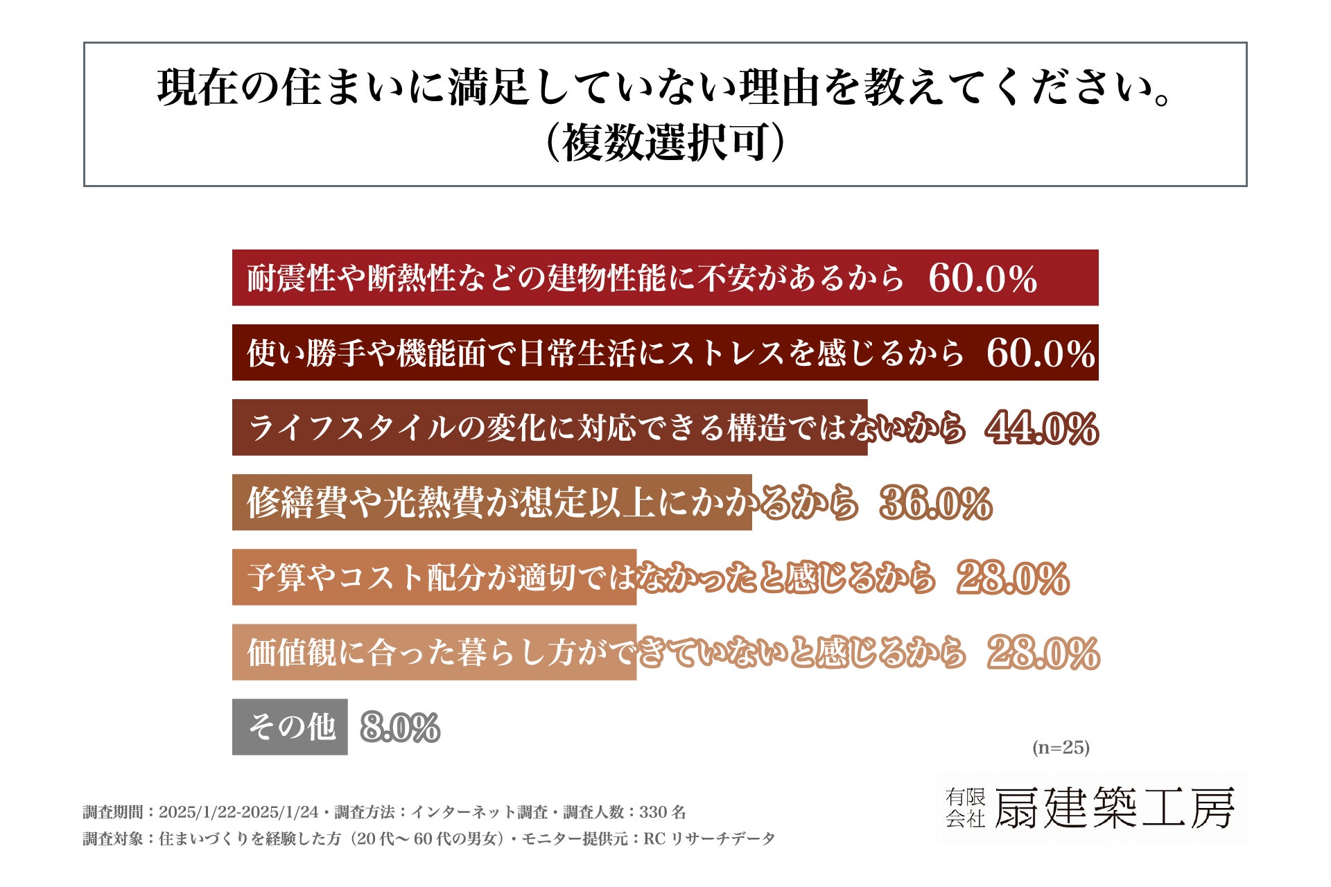 調査の最後、前問の設問で現在の住まいに満足していない(「あまり満足していない」と回答された方を含む)と回答された方に「現在の住まいに満足していない理由」を尋ねる設問への回答で多かったのは、1位が同率で「耐震性や断熱性などの建物性能に不安があるから」と「使い勝手や日常生活にストレスを感じるから」で60.0%、2位が「ライフスタイルの変化に対応できる構造ではないから」で44.0%という結果になりました。この結果から、こうした人が現在の住まいに満足していない主な理由は「耐震性や断熱性などの建物性能」と「使い勝手や機能面で起こる日常生活のストレス」であることが明らかになりました。