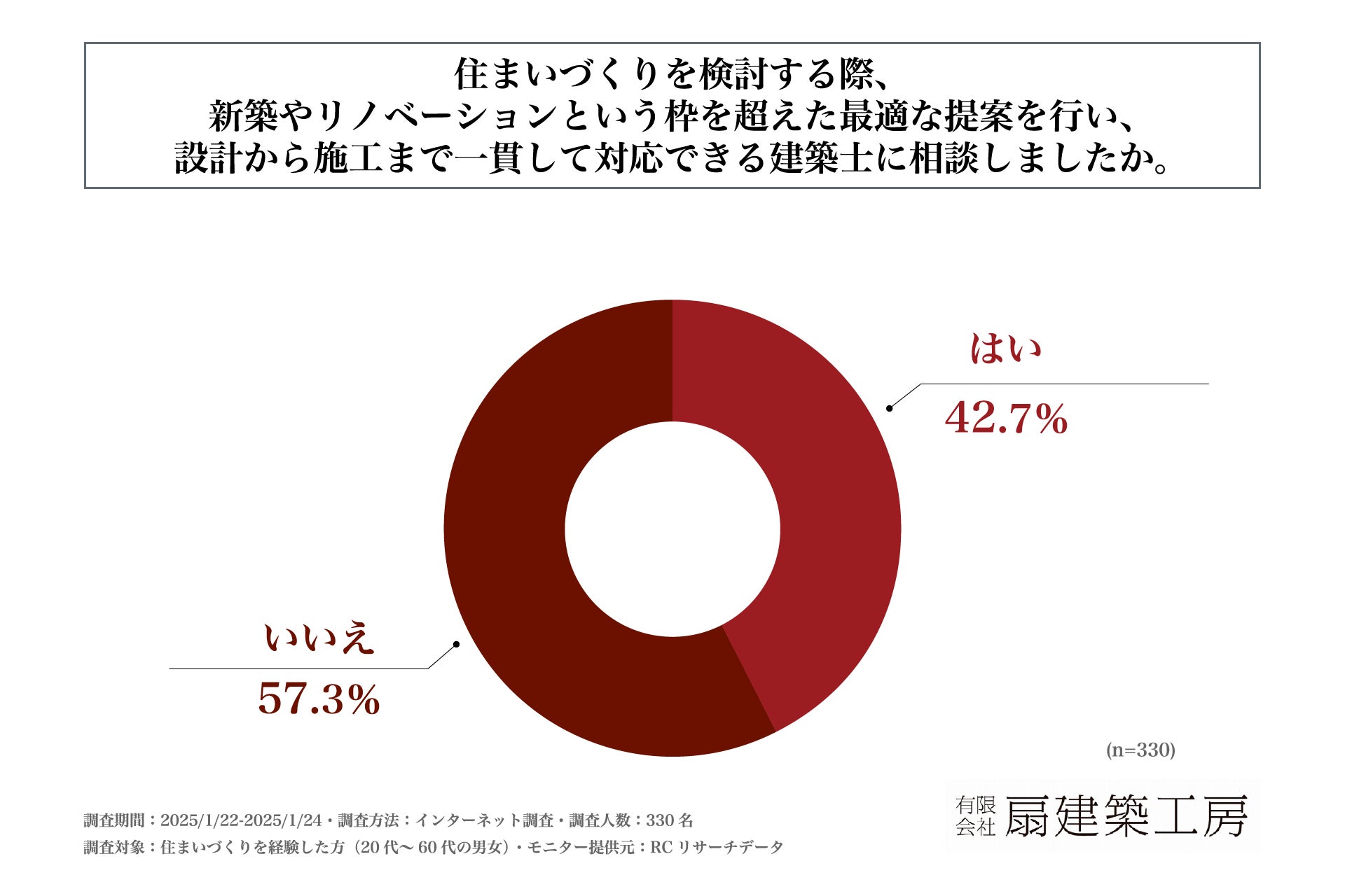 また、「住まいづくりを検討する際、新築やリノベーションという枠を超えた最適な提案を行い、設計から施工まで一貫して対応できる建築士に相談したか」を尋ねる設問の回答では、「いいえ」が57.3%、「はい」が42.7%という結果になりました。この結果から、住まいづくりを検討する際、新築やリノベーションという枠を超えた最適な提案を行い、設計から施工まで一貫して対応できる建築士に相談した人の割合は4割強であることが明らかになりました。
