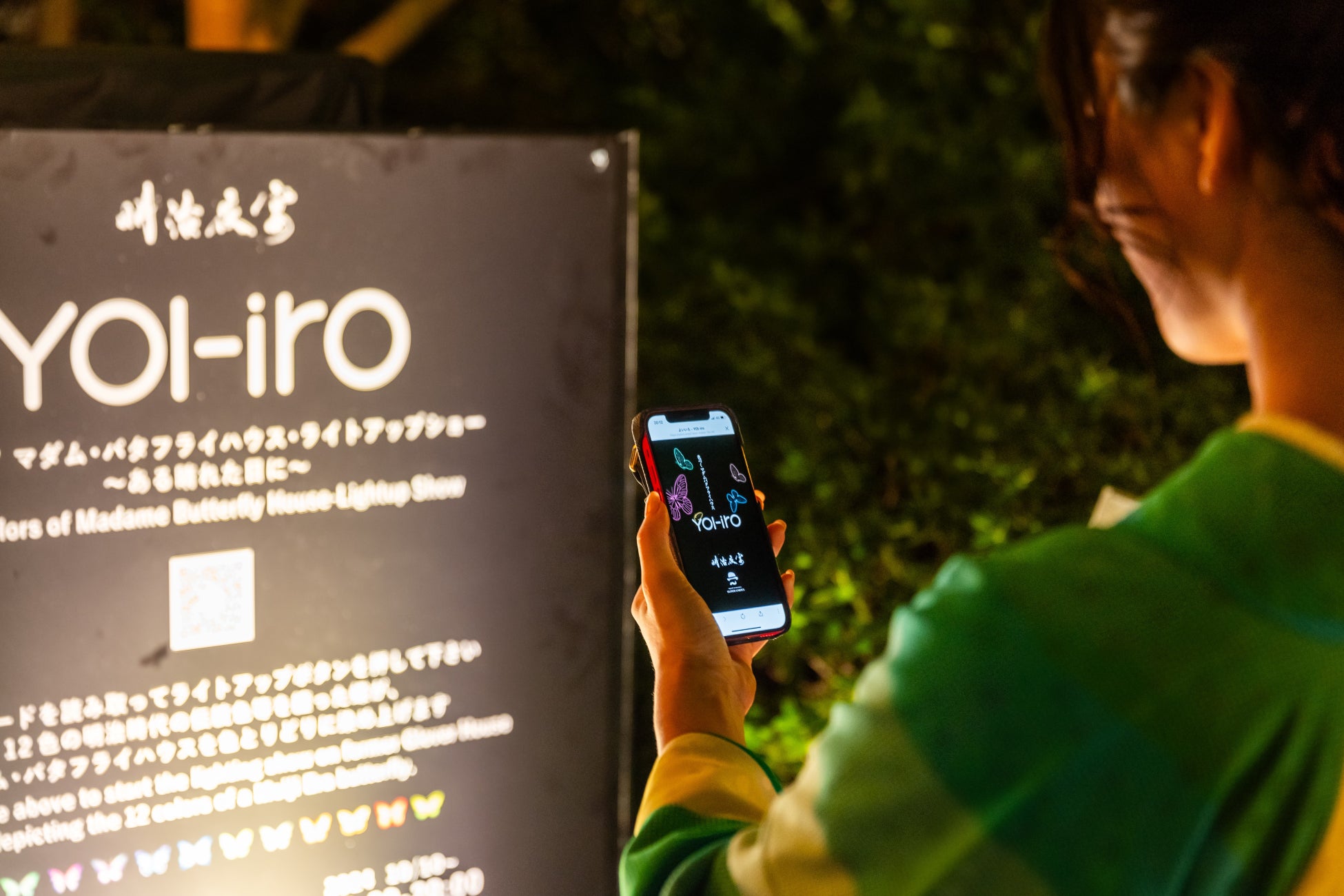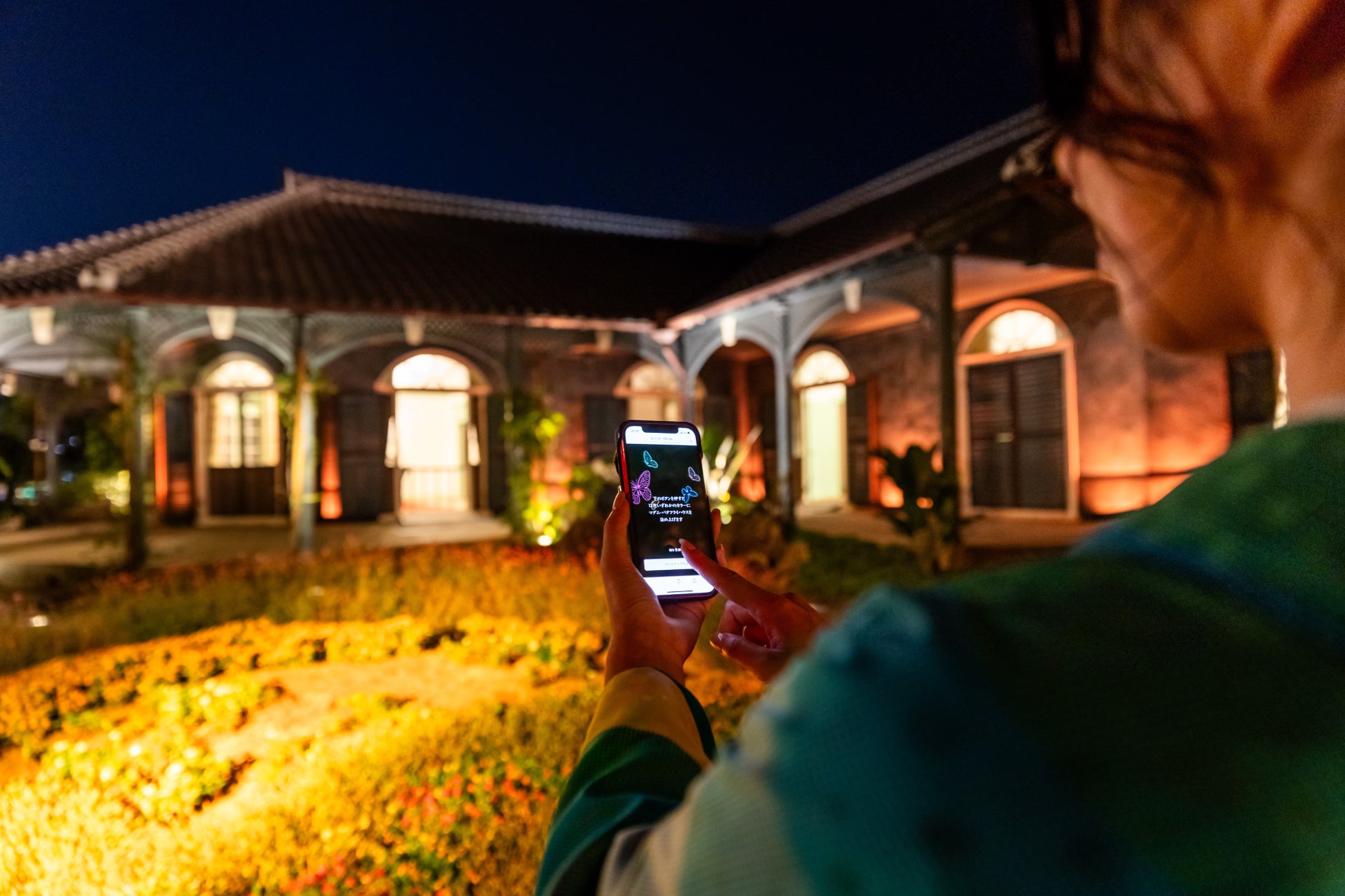 「旧グラバー住宅」の照明演出が、来場者参加型のライトアップショーにアップデート。スマートフォ ンを使ってマダム・バタフライ・ハウスを色とりどりの明治時代の伝統色などに染め上げ、来場者の染め 上げた色が集まると、色彩豊かな光のショータイムがスタートします。