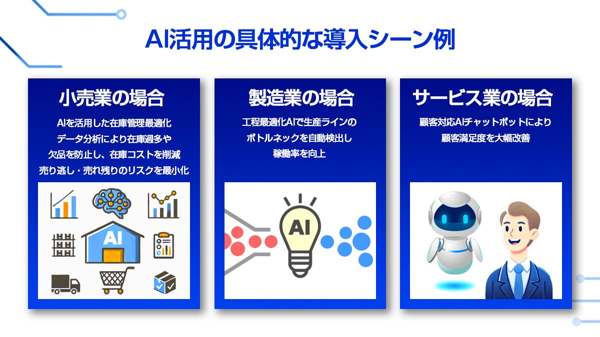 小売業: AIを活用した在庫管理最適化。データ分析により在庫過多や欠品を防止し、在庫コストを削減。売り逃し・売れ残りのリスクを最小化。