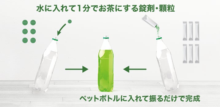 ペットボトルの水に溶けるお茶の錠剤・顆粒
