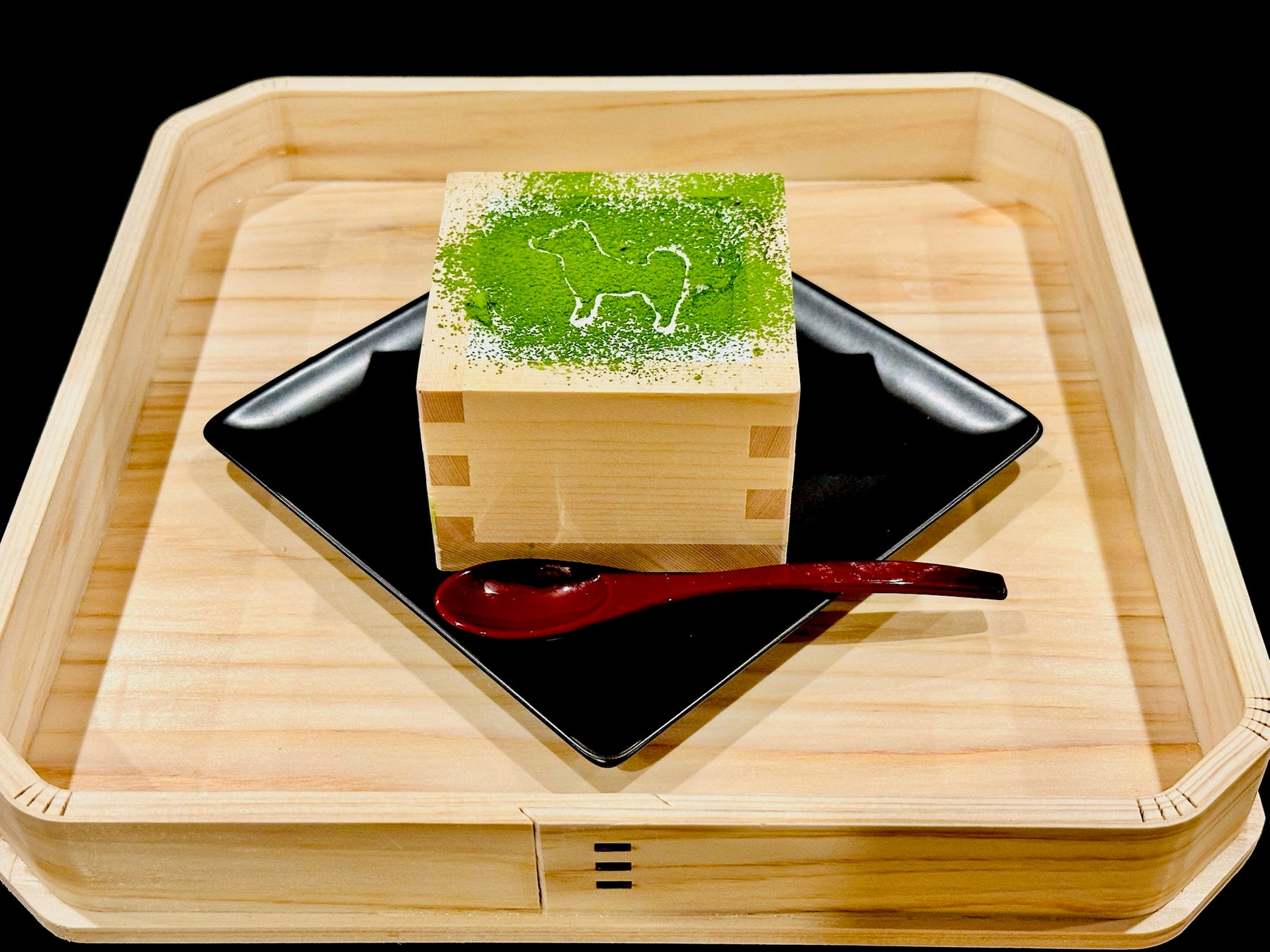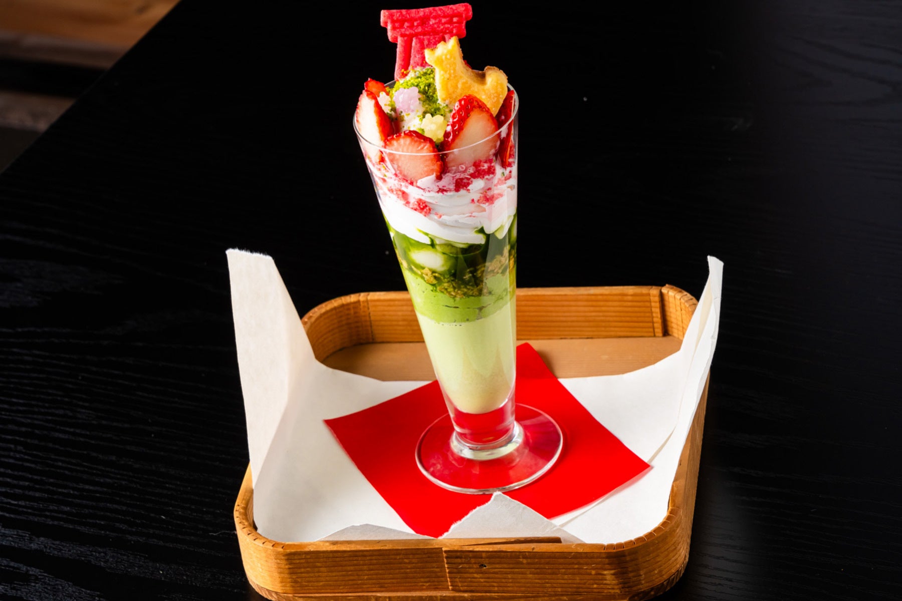 菱餅の色味をパフェで再現。デザインのテーマは「看板犬しろちゃんの神社参拝」です。